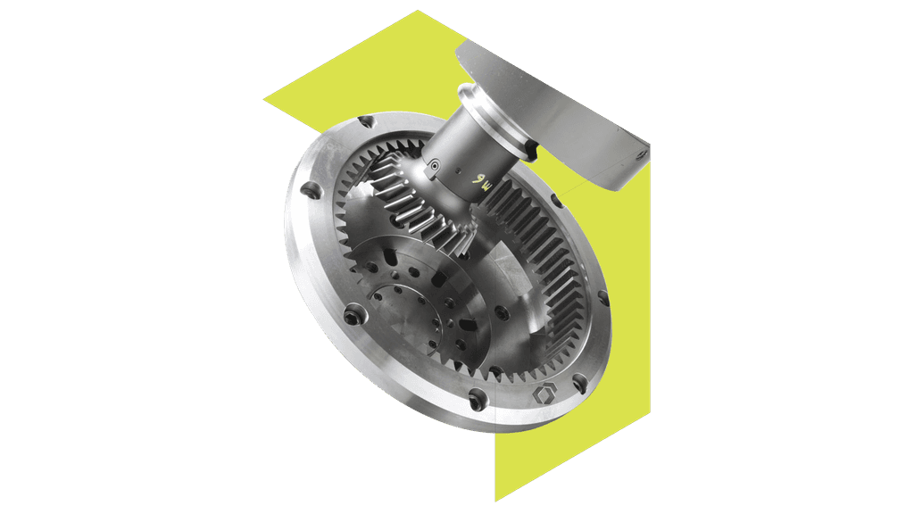 Rotates around the sun gear and meshes with both sun and ring gears. Enables high torque transmission in limited space.